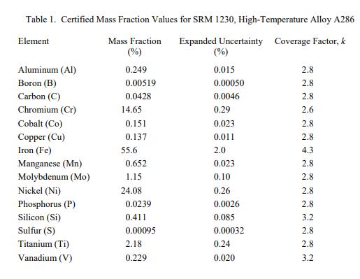 被測量是 SRM 1230 中每種成分的認(rèn)證值。認(rèn)證值在表 1 中提供,并以質(zhì)量分?jǐn)?shù)報(bào)告 [1]。隨數(shù)值列出的不確定度是擴(kuò)展不確定度,U = kuc,基于 95% 置信水平 [2],根據(jù) ISO/JCGM 指南 [3] 中的方法計(jì)算。 NIST 認(rèn)證值是 NIST 對其準(zhǔn)確性具有最高置信度的值,因?yàn)樗幸阎蚩梢傻钠顏碓炊家驯徽{(diào)查或考慮 [4]。認(rèn)證值是根據(jù) NIST 和合作實(shí)驗(yàn)室進(jìn)行的分析結(jié)果對“真實(shí)”值的當(dāng)前最佳估計(jì)。用于確定成分的測試方法在附錄 A 和隨附的關(guān)鍵字中確定。計(jì)量溯源性是導(dǎo)出的 SI 單位的質(zhì)量分?jǐn)?shù)(以百分比表示)。