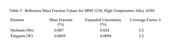 被測量是表 2 中提供的鈮和鎢的參考值,通過規(guī)定的方法確定。參考值在表 2 中給出。參考值是非認(rèn)證值,是當(dāng)前對真實(shí)值的最佳估計(jì);但是,這些值不符合 NIST 的認(rèn)證標(biāo)準(zhǔn),并且提供了相關(guān)的不確定性,可能不包括不確定性的所有組成部分 [4]。隨數(shù)值列出的不確定度是基于 95% 置信水平 [4] 的擴(kuò)展不確定度,根據(jù) ISO/JCGM 指南 [3] 中的方法計(jì)算。計(jì)量溯源性是導(dǎo)出的 SI 單位的質(zhì)量分?jǐn)?shù)(以百分比表示)。