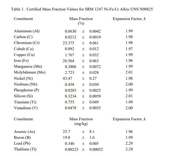 SRM 1247 的認(rèn)證質(zhì)量分?jǐn)?shù)值列于表 1 [1]。賦值類別基于 NIST 用于化學(xué)參考物質(zhì) [2] 認(rèn)證的術(shù)語和模式的定義。 NIST 認(rèn)證值是 NIST 對(duì)其準(zhǔn)確性有最高置信度的值,