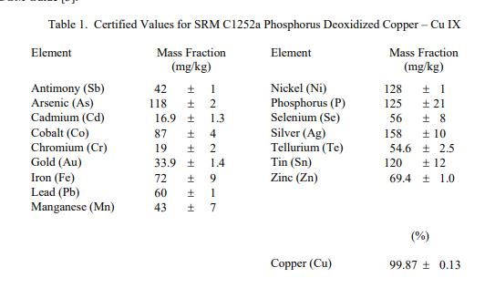 NIST SRM C1252a 磷脫氧銅–CuIX(標(biāo)準(zhǔn)品)主要用于評(píng)估化學(xué)分析方法和校準(zhǔn)用于分析銅及其合金的儀器方法。 SRM C1252a 的一個(gè)單元由一個(gè)定向凝固的冷鑄塊組成,大約 32 毫米見(jiàn)方和 19 毫米厚。