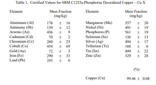 NIST SRM C1253a 磷脫氧銅–Cu X(標(biāo)準(zhǔn)品)主要用于評估化學(xué)分析方法和校準(zhǔn)用于分析銅及其合金的儀器方法。 SRM C1253a 的一個單元由一個定向凝固的冷鑄塊組成,大約 32 毫米見方和 19 毫米厚。