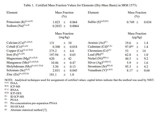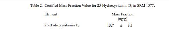 表 1 中提供了元素的認(rèn)證質(zhì)量分?jǐn)?shù)值。表 2 中提供了 25-羥基維生素. D3 的認(rèn)證質(zhì)量分?jǐn)?shù)值。元素的認(rèn)證值基于所執(zhí)行的主要分析技術(shù)的結(jié)果在 NIST 或在 NIST 和合作專家實(shí)驗(yàn)室獲得的兩種或多種化學(xué)獨(dú)立分析技術(shù)的組合結(jié)果 [1]。 25-羥基維生素 .D3 的認(rèn)證值基于 NIST 和合作專家實(shí)驗(yàn)室的綜合結(jié)果。 NIST 認(rèn)證值是 NIST 對(duì)其準(zhǔn)確性具有最高置信度的值,因?yàn)樗幸阎蚩梢傻钠顏碓炊家驯徽{(diào)查或考慮在內(nèi) [1]。