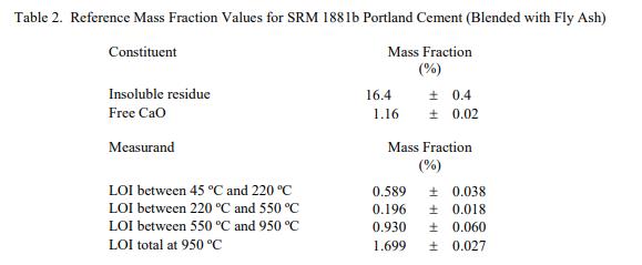 成分和燒失量 (LOI) 的參考值在表 2 中報(bào)告為質(zhì)量分?jǐn)?shù)。 NIST 參考值是未經(jīng)認(rèn)證的值,它是基于可用數(shù)據(jù)對真實(shí)值的當(dāng)前最佳估計(jì);但是,該值不符合 NIST 認(rèn)證標(biāo)準(zhǔn)并提供相關(guān)的不確定性可能僅反映測量再現(xiàn)性,可能不包括所有不確定性來源,或者可能反映多種分析方法之間缺乏足夠的統(tǒng)計(jì)一致性 [2]。