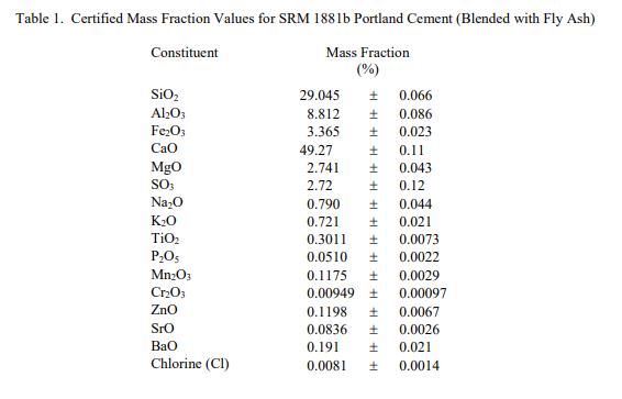 SRM 1881b 成分的認(rèn)證值在表 1 中報(bào)告為質(zhì)量分?jǐn)?shù) [1]。 NIST 認(rèn)證值是 NIST 對其準(zhǔn)確性具有最高置信度的值,因?yàn)樗幸阎蚩梢傻钠顏碓炊家驯徽{(diào)查或考慮在內(nèi) [2]。認(rèn)證值是存在的真實(shí)值的最佳估計(jì)。