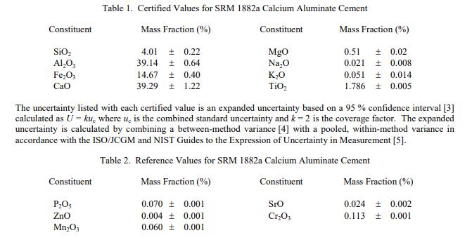 表 1 中提供了八種元素的認(rèn)證值,以氧化物形式表示為質(zhì)量分?jǐn)?shù) [1],在收到的基礎(chǔ)上。NIST 認(rèn)證值是 NIST 對(duì)其最有信心的值。準(zhǔn)確性,因?yàn)樗幸阎蚩梢傻钠顏?lái)源都已被調(diào)查或考慮帳戶。列出的認(rèn)證值基于 NIST 和 Construction Technology Laboratories, Inc. (CTL) 使用 X 射線熒光光譜法、原子吸收光譜法和 ASTM C 114-97 標(biāo)準(zhǔn)測(cè)試方法中給出的參考方法進(jìn)行的分析結(jié)果液壓化學(xué)分析水泥 [2]。使用 X 射線熒光光譜法進(jìn)行均勻性測(cè)試。