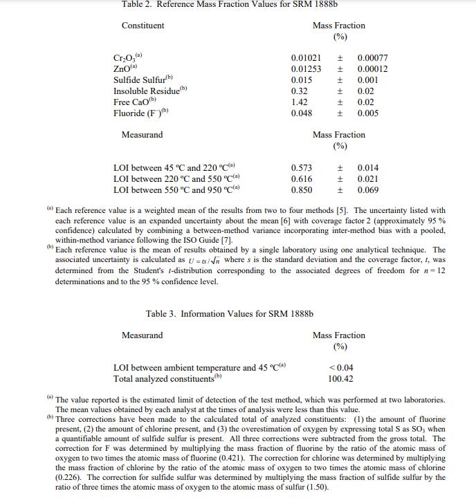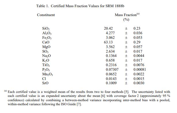NIST SRM 1888b 硅酸鹽水泥(標(biāo)準(zhǔn)品)表 3 中報(bào)告了兩個(gè)信息值。信息值被認(rèn)為是 SRM 用戶感興趣的值,但沒有足夠的信息來評(píng)估與值相關(guān)的不確定性 [2]。