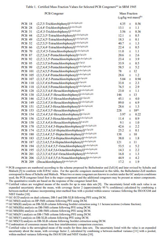 測(cè)量值是分別在表 1、2 和 3 中提供的每種 PCB 同系物、氯化農(nóng)藥和 PBDE 同系物的總質(zhì)量分?jǐn)?shù)。計(jì)量溯源性是質(zhì)量分?jǐn)?shù)的 SI 派生單位(以微克/千克濕基表示)。 NIST 認(rèn)證值是對(duì)其準(zhǔn)確性有最高置信度的值,因?yàn)樗幸阎蚩梢傻钠顏碓炊家驯徽{(diào)查或考慮在內(nèi) [2]。 PCB 同系物、氯化農(nóng)藥和 PBDE 同系物的認(rèn)證值基于 NIST 從兩種或多種化學(xué)獨(dú)立分析技術(shù)獲得的結(jié)果與實(shí)驗(yàn)室間比較研究結(jié)果的一致性。