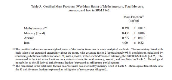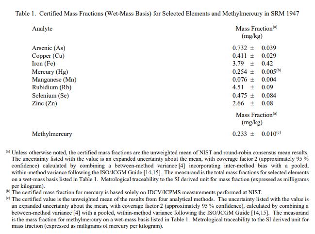 NIST SRM 1947密西根湖魚類組織(標準品)表 5 中提供了其他 PCB 同系物、氯化農(nóng)藥、PBDE 同系物和全氟辛烷磺酸 (PFOS) 的參考質(zhì)量分數(shù)值。表 6 和表 7 中提供了近似值、熱量含量、選定脂肪酸的參考值。表 8 顯示了 SRM 1947 中 Hg 同位素比差異的參考值。參考值是代表基于真實值的最佳估計的非認證值關(guān)于可用數(shù)據(jù);但是,這些值不符合 NIST 的認證標準 [1],并且提供了相關(guān)的不確定性,這些不確定性可能僅反映測量再現(xiàn)性,可能不包括所有不確定性來源,或者可能反映多種分析方法之間缺乏足夠的統(tǒng)計一致性。