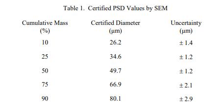 計量溯源性是長度的 SI 單位(以微米表示)。根據(jù) ISO/JCGM 和 NIST 指南 [2] 計算的每個百分位數(shù)的不確定度是 95% 置信水平的擴展不確定度,其中包括由于測量不精確和材料可變性導(dǎo)致的不確定度。每個經(jīng)認(rèn)證的直徑及其擴展的不確定性定義了一個直徑范圍,相關(guān)百分位數(shù)預(yù)計至少有 95% 的樣品位于該直徑范圍內(nèi)。