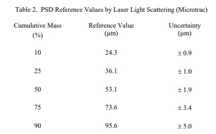 通過掃描電子顯微鏡 (SEM) 和激光散射 (LLS) 以及篩分 [1] 測量了五個質(zhì)量百分位數(shù)的 PSD 值。 SEM 認(rèn)證的 PSD 值列于表 1。這些認(rèn)證值是通過測量來自五個瓶子的 20 000 多個單個顆粒而確定的。 LLS 和篩分的參考 PSD 值列于表 2 和表 3。所有三種方法的比較如圖 1 所示。