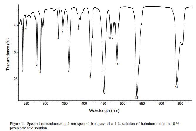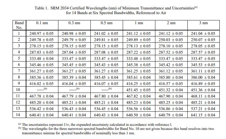 SRM 2034氧化鈥溶液波長標(biāo)準(zhǔn)表 1 給出了從 240 nm 到 650 nm 的 14 個波段和從 0.1 nm 到 3.0 nm 的 6 個光譜帶寬的最小透射率的認(rèn)證波長。這些認(rèn)證值適用于所有系列的 SRM 2034 以及現(xiàn)在的那個。 SRM 2034 對于 1 nm 光譜帶寬的透射光譜,參考空氣,如圖 1 所示。被測量是表 1 中的認(rèn)證波長,并且在計量上可追溯到以納米表示的 SI 派生單位。