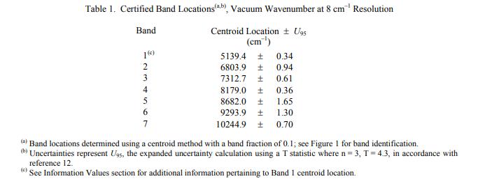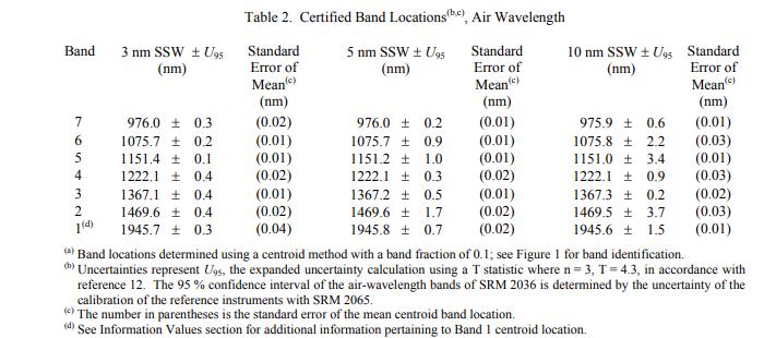 表 1 列出了 7 個(gè)反射吸收波段的認(rèn)證真空波數(shù)位置,范圍從 10 300 cm-1 到 5 130 cm-1。7 個(gè) NIR 空氣波長(zhǎng)波段位置的認(rèn)證值表 2 列出了從 976 nm 到 1946 nm 的反射吸收波段。 NIST 認(rèn)證值是 NIST 對(duì)其準(zhǔn)確性有最高置信度的值,因?yàn)樗幸阎蚩梢傻钠顏?lái)源都已被充分調(diào)查或考慮在內(nèi)[1]。