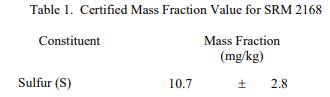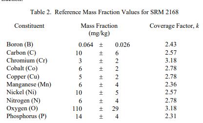 已知或可疑的偏倚來源已被調(diào)查或考慮 [2]。認(rèn)證值是根據(jù) NIST 和合作實(shí)驗(yàn)室使用表 4 中所示測試方法進(jìn)行的分析結(jié)果對(duì)真實(shí)值的當(dāng)前最佳估計(jì)。