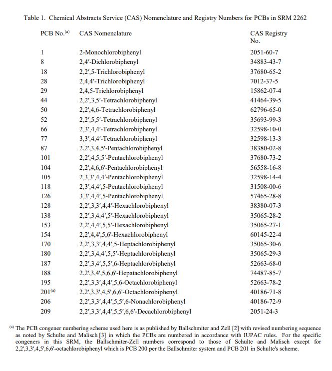 NIST SRM 2262 2,2,4-三甲基戊烷PCB同系物(標(biāo)準(zhǔn)品)是 28 種氯化聯(lián)苯同系物(也稱為多氯聯(lián)苯 (PCB) 同系物)在 2,2,4-三甲基戊烷(異辛烷)中的溶液。表 1 中列出了每種成分的化學(xué)文摘社 (CAS) 命名法和登記號(hào)。此 SRM 主要用于校準(zhǔn)色譜儀器,用于確定經(jīng)認(rèn)證的化合物。一個(gè) SRM 2262 單元由五個(gè) 2 mL 安瓿組成,每個(gè)安瓿含有大約 1.2 mL 溶液。