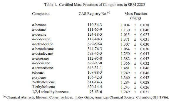 表 2 中提供了組分的濃度信息值,以體積分?jǐn)?shù)百分比表示。信息值被認(rèn)為是 SRM 用戶感興趣和使用的值,但沒(méi)有足夠的信息來(lái)充分評(píng)估與該值相關(guān)的不確定性,或者只進(jìn)行了有限數(shù)量的分析 [1]。