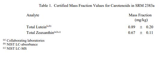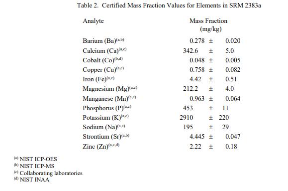 表 1 和表 2 中提供了 SRM 2383a 中類(lèi)胡蘿卜素和元素的認(rèn)證質(zhì)量分?jǐn)?shù)值,按原樣報(bào)告。NIST 認(rèn)證值是 NIST 對(duì)其準(zhǔn)確性有最高置信度的值因?yàn)樗幸阎蚩梢傻钠?jiàn)來(lái)源都已被調(diào)查或考慮到[1]。價(jià)值分配分析由 NIST 和合作實(shí)驗(yàn)室進(jìn)行。