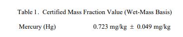 表 1 中提供了汞的認(rèn)證值,表示為基于濕質(zhì)量(原樣)的質(zhì)量分?jǐn)?shù) [1]。該值基于使用冷蒸汽的主要方法進(jìn)行的分析同位素稀釋電感耦合等離子體質(zhì)譜 (CV-ID-ICP-MS) [2,3]。 NIST 認(rèn)證值是 NIST 對(duì)其準(zhǔn)確性具有最高置信度的值,因?yàn)樗幸阎蚩梢傻钠顏?lái)源都已被調(diào)查或考慮 [4]。認(rèn)證值的不確定度以擴(kuò)展不確定度的形式給出,以大約 95% 的置信度覆蓋被測(cè)量。擴(kuò)展不確定度計(jì)算為 U = kuc,其中 uc 是與 ISO/JCGM 指南 [5] 一致的組合標(biāo)準(zhǔn)不確定度,k 是覆蓋因子,(k = 2) 對(duì)應(yīng)于大約 95% 的置信度。被測(cè)量是汞的總質(zhì)量分?jǐn)?shù)。