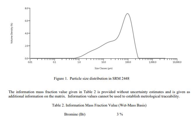 認(rèn)證值在計(jì)量學(xué)上可追溯到 SI 質(zhì)量單位,以濕質(zhì)量為基礎(chǔ)的毫克/千克表示。信息值:溴的粒徑和質(zhì)量分?jǐn)?shù)的信息值分別在圖 1 和表 2 中提供。信息值被認(rèn)為是 SRM 用戶(hù)感興趣的值,但沒(méi)有足夠的信息來(lái)評(píng)估與該值相關(guān)的不確定性,或者只有有限數(shù)量的進(jìn)行了分析[3]。信息值不能用于建立計(jì)量溯源性。
