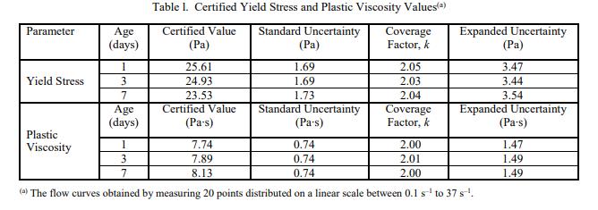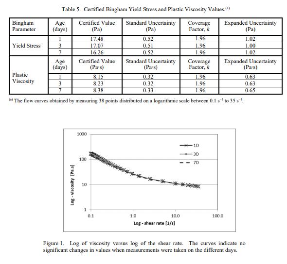 NIST 認證值是 NIST 對其準確性有最高置信度的值,并且所有已知或可疑的偏差來源都已調(diào)查或考慮在內(nèi) [1]。經(jīng)認證的 Bingham 屈服應力和塑性粘度值在表 1 中給出,并且是基于在 NIST 由單個操作員使用平行鋸齒板流變儀進行的分析測量結果。粘度與剪切的完整曲線