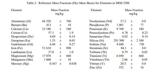 NIST SRM 2586涂料中含鉛土壤中的微量元素(標準品)旨在用于評估測定土壤中鉛、微量元素和全氟辛烷磺酸 (PFOS) 的分析方法。 SRM 2586 是從城市地區(qū)收集的土壤樣本的混合混合物,據信鉛的主要來源來自舊房子的含鉛涂料。所有值均以質量分數(shù) [1] 的形式報告,以干重為基礎,并且基于使用至少 200 mg 樣品質量的測量值。一個 SRM 2586 單元由大約 55 克粒徑<75 微米(200 目)的材料組成。