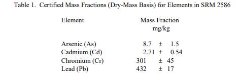 表 1 中提供了四種對環(huán)境重要的元素的認證質量分數(shù)值。NIST 認證值是 NIST 對其準確性有最高置信度的值,因為所有已知或可疑的偏差來源都已調查或由 NIST [2] 解釋。被測量是表 1 中元素的認證質量分數(shù),在計量上可追溯到 SI 質量分數(shù)單位以毫克每公斤表示。