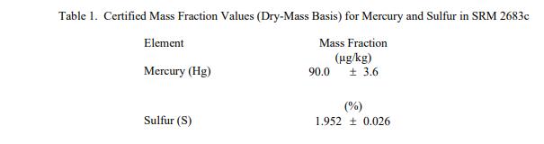 表 1 中提供了汞和硫的認證值,以基于干質量的質量分數(shù) [1] 表示。汞認證值基于或直接溯源到單一 NIST 主要方法。 NIST 認證值是 NIST 對其準確性具有最高置信度的值,因為所有已知或可疑的偏差來源都已被調(diào)查或考慮在內(nèi) [2]。