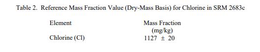 表 2 中提供了氯的參考值,表示為基于干質量的質量分數(shù) [1]。參考值是非認證值,是對真實值的最佳估計;但是,該值不符合 NIST 的認證標準,并且提供了相關的不確定性,該不確定性可能僅反映測量精度,可能不包括所有不確定性來源 [2]。