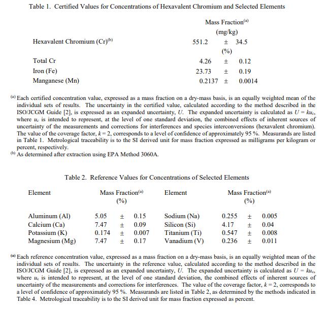 表 1 給出了 SRM 2701 中六價鉻、總鉻、鐵和錳的認證濃度。NIST 認證值是 NIST 在所有已知或可疑來源中對其準確性有最高置信度的值偏見已經(jīng)被調(diào)查或考慮[1]。認證值基于兩種或多種獨立分析方法的結(jié)果一致。六價鉻的認證值是 NIST 和三個合作實驗室進行的分析測量的未加權(quán)平均值。該值基于使用經(jīng)批準的美國環(huán)境保護署 (EPA) SW-846 分析方法(方法 3060A)從材料中提取的六價鉻,所有參與實驗室均使用該方法。總鉻和鐵的認證值是 NIST 三種獨立分析方法結(jié)果的未加權(quán)平均值。錳的認證值是 NIST 兩種獨立分析方法結(jié)果的未加權(quán)平均值。