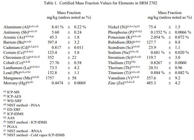 表 1 中提供了元素的認(rèn)證值,以質(zhì)量分?jǐn)?shù)表示。認(rèn)證值基于 NIST 和合作實(shí)驗室執(zhí)行的兩種或多種獨(dú)立分析技術(shù)的結(jié)果一致 [1]。 NIST 認(rèn)證值是 NIST 對其準(zhǔn)確性有最高置信度的值,因為所有已知或可疑的偏差來源都已被調(diào)查或考慮在內(nèi)。
