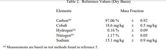 表 2 中提供了以干基質(zhì)量分?jǐn)?shù)表示的參考值。鈷和鈉的參考值基于單一 NIST 方法。碳、氫和氮的值基于 LECO 公司(密歇根州圣約瑟夫)執(zhí)行的單一方法,并得到實(shí)驗(yàn)室質(zhì)量服務(wù)國際代表 NIST 管理的實(shí)驗(yàn)室間分析研究結(jié)果的證實(shí)。參考值是對真實(shí)值的最佳估計(jì)的非認(rèn)證值;但是,這些值不符合 NIST 認(rèn)證標(biāo)準(zhǔn),并且提供了相關(guān)的不確定性,這些不確定性可能僅反映測量精度,可能不包括所有不確定性來源。
