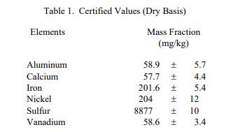 表 1 中提供了認(rèn)證值,以干基的質(zhì)量分?jǐn)?shù) [1] 表示。NIST 認(rèn)證值是 NIST 對其準(zhǔn)確性有最高置信度的值,因?yàn)樗幸阎蚩梢蓙碓碞IST 已經(jīng)調(diào)查或解釋了偏差。鋁、鈣、鐵、鎳和釩的認(rèn)證值基于兩種獨(dú)立的 NIST 方法。硫的認(rèn)證值基于單一的 NIST 主要方法。