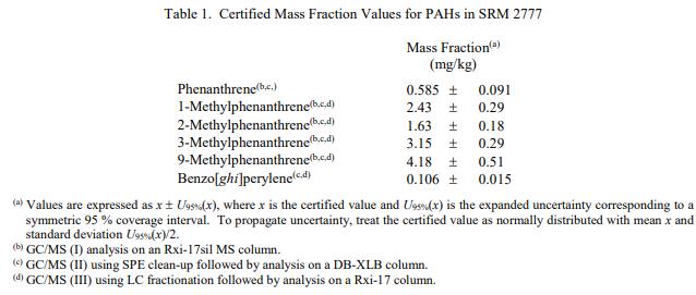 表 1 中提供了 PAH 的認(rèn)證質(zhì)量分?jǐn)?shù)值。 NIST 認(rèn)證值是 NIST 對(duì)其準(zhǔn)確性有最高置信度的值,因?yàn)樗幸阎蚩梢傻钠顏碓炊家颜{(diào)查或考慮在內(nèi)[1]。認(rèn)證值基于 NIST 使用多種分析技術(shù)獲得的結(jié)果的一致性。
