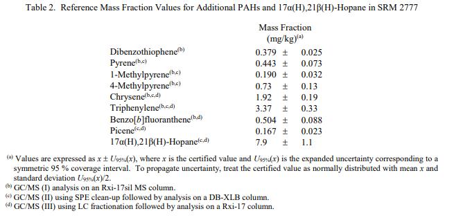 表 2 中提供了額外 PAH 和 17α(H),21β(H)-藿烷的參考質(zhì)量分?jǐn)?shù)值。參考值是未經(jīng)認(rèn)證的值,是對(duì)真實(shí)值的估計(jì)。