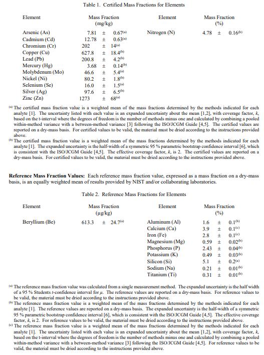 表 2 至表 5 中提供了元素和有機(jī)成分的參考質(zhì)量分?jǐn)?shù)值;表 7 末尾提供了分析方法。參考值是未經(jīng)認(rèn)證的值,是基于可用數(shù)據(jù)對(duì)真實(shí)值的最佳估計(jì)。這些值不符合 NIST認(rèn)證標(biāo)準(zhǔn)并提供相關(guān)的不確定性,這些不確定性可能僅反映測(cè)量再現(xiàn)性,可能不包括所有不確定性來源,或者可能反映多種分析方法之間缺乏足夠的統(tǒng)計(jì)一致性 [1]。被測(cè)量是表 2 至表 5 中列出的質(zhì)量分?jǐn)?shù),由規(guī)定的方法確定,并且在計(jì)量上可追溯到 SI 單位,以百分比或微克/千克表示的質(zhì)量分?jǐn)?shù),如表中所示。