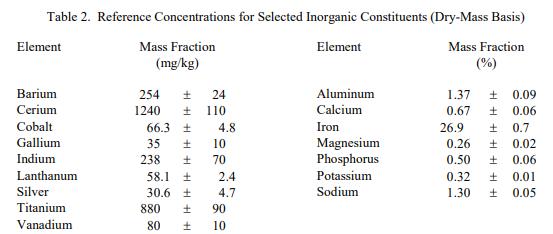 表 2 中報(bào)告了 16 種其他元素的參考值,以干基質(zhì)量分?jǐn)?shù)表示。NIST 參考值是未經(jīng)認(rèn)證的值,是當(dāng)前對(duì)真實(shí)值的最佳估計(jì);但是,該值不符合 NIST 認(rèn)證標(biāo)準(zhǔn),并提供了相關(guān)的