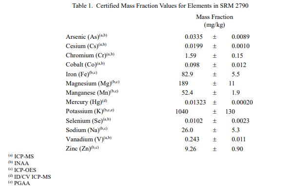 SRM 2790 中元素的認證質(zhì)量分數(shù)值,以干質(zhì)量為基礎(chǔ)報告,灰分分別在表 1 和表 2 中提供。 NIST 認證值是 NIST 對其準確性具有最高置信度的值,因為所有已知或可疑的偏差來源都已被調(diào)查或考慮在內(nèi) [1]。 NIST 進行了賦值分析。認證的質(zhì)量分數(shù)值計算為 NIST 方法的平均值的平均值。相關(guān)的不確定性以大約 95% 的置信水平表示 [2-4]。