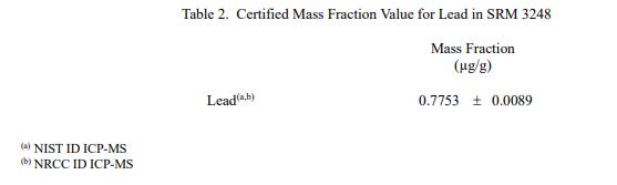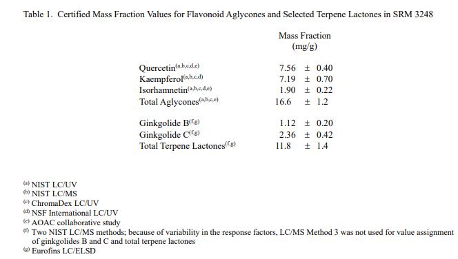 NIST 認證值是 NIST 對其準確性有最高置信度的值,因為所有已知或可疑的偏差來源都已調(diào)查或考慮在內(nèi) [1]。表 1 和表 2 中提供了選定類黃酮、萜內(nèi)酯和鉛的認證濃度值。這些值來自 NIST 和合作實驗室提供的結(jié)果的組合。該材料中的認證值是各組 NIST 結(jié)果的同等加權(quán)平均值和合作實驗室進行的組合測量值的平均值;相關(guān)的不確定性是 95% 置信水平的擴展不確定性 [2,3]。以質(zhì)量分數(shù)單位 [4] 以干質(zhì)量為基礎(chǔ)報告值。
