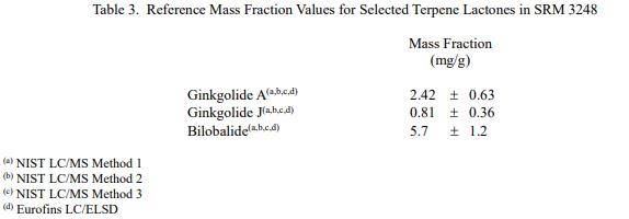 NIST 參考值是未經(jīng)認證的值,它是基于可用數(shù)據(jù)對真實值的最佳估計;但是,該值不符合 NIST 的認證標準 [1],并帶有相關(guān)的不確定性,這些不確定性可能僅反映測量再現(xiàn)性,可能不包括所有不確定性來源,或者可能反映多種分析方法之間缺乏足夠的統(tǒng)計一致性。表 3 中提供了其他萜內(nèi)酯的參考濃度值。表 4 中提供了砷、鎘和汞的參考值。