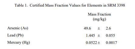表 1 提供了 SRM 3398 中基于干質(zhì)量報(bào)告的痕量元素認(rèn)證質(zhì)量分?jǐn)?shù)值。NIST 認(rèn)證值是 NIST 對(duì)其準(zhǔn)確性有最高信心的值已知或可疑的偏倚來源已被調(diào)查或考慮 [1]。價(jià)值分配分析由 NIST 和合作實(shí)驗(yàn)室進(jìn)行。認(rèn)證值計(jì)算為 NIST 方法平均值的未加權(quán)平均值和合作實(shí)驗(yàn)室平均值的加權(quán)中值(在適當(dāng)?shù)那闆r下)。相關(guān)的不確定性以大約 95% 的置信水平表示 [2-5]。