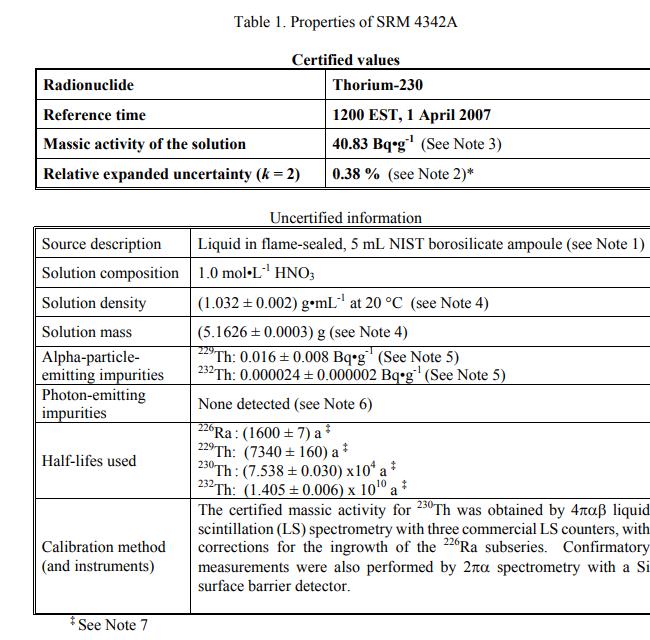 在 2007 年 4 月 1 日美國(guó)東部標(biāo)準(zhǔn)時(shí)間 1200 的參考時(shí)間,經(jīng)認(rèn)證的釷 230 質(zhì)量活度值為:(40.83 ± 0.16) Bq?g-1